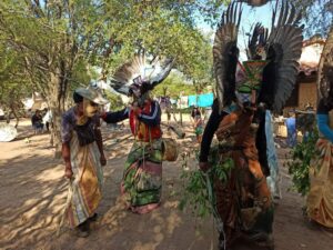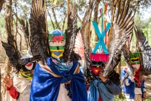 Los participantes usan máscaras de madera de yuchán talladas a mano que representan a los ancestros (agüeros).