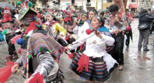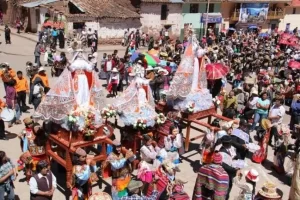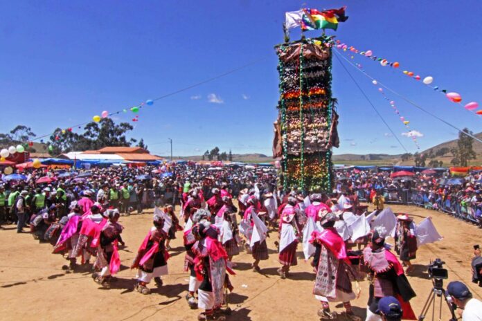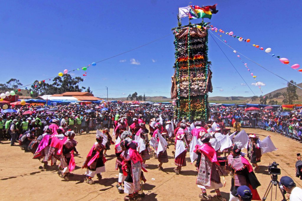 Gira en torno a la Pukara, una inmensa torre de madera cubierta de productos agrícolas (maíz, frutas, carne, pan) como ofrenda a la tierra.