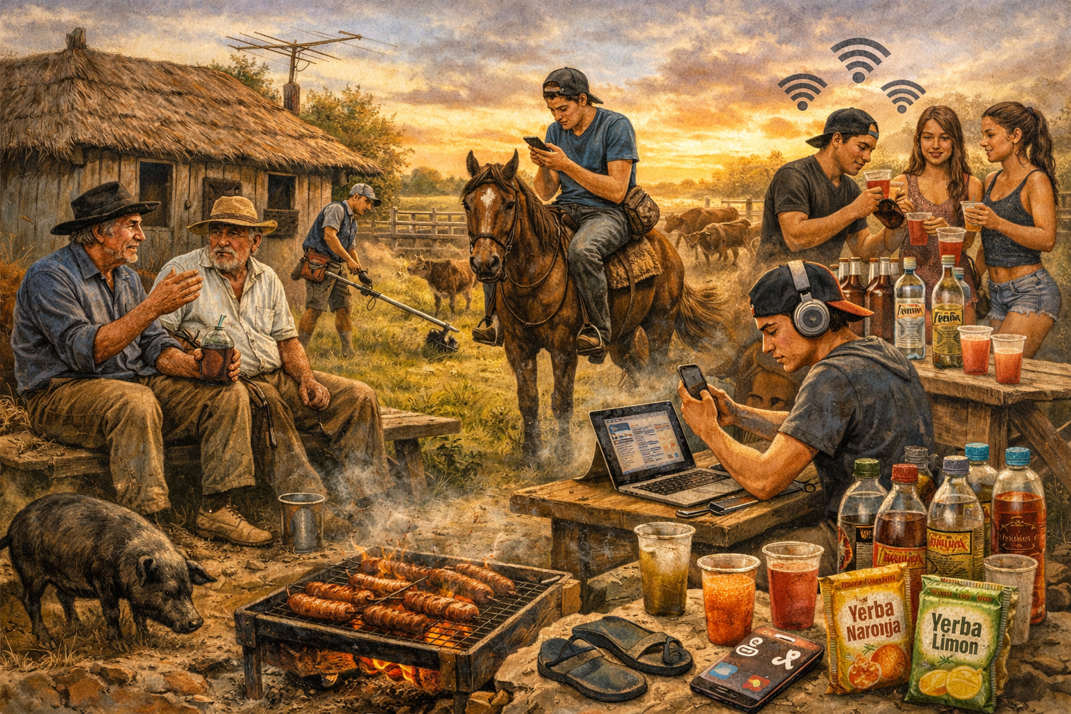 Dice que navega y nosotros no tenemos ni río ni arroyo, apenas un tajamar chiquito y un sangrador que da para los vecinos de Campoamor. Yo le digo, pero mijo, usted así, por lo que veo navega en la humedad, porque agua no hay. Y él me responde, no, navego en las redes sociales, en las redes, viejo. Yo le miro el aparatito y ahí ni una piola ni nada, no sé en que red puede navegar, si no entra ni una chalana, pero en fin, así están las cosas, y todavía el hombre viejo que fue Presidente se pone a repicar que quiere poblar el campo, poblar se puede, pero, que quieran trabajar, que sepan hacer las cosas que hicimos nosotros toda la vida, difícil que el chancho chifle…