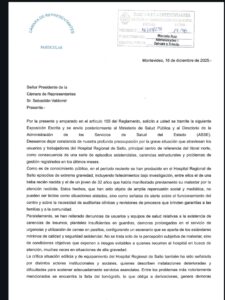 Con fallecimientos bajo investigación, carencias estructurales y una conducción en crisis, el Hospital Regional de Salto atraviesa una situación límite. El diputado Horacio de Brum presentó una Exposición Escrita en el Parlamento dirigida al Ministerio de Salud Pública y a ASSE, reclamando una intervención integral que garantice equidad, calidad asistencial y justicia sanitaria para el norte del país.