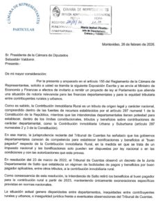 Hemos presentado una exposici贸n escrita dirigida al Ministerio de Econom铆a y Finanzas en la que planteamos la necesidad de una ley que habilite expresamente a las intendencias a otorgar bonificaciones por pago contado y buen pagador en la contribuci贸n inmobiliaria rural, en las mismas condiciones que ya aplican para la contribuci贸n urbana