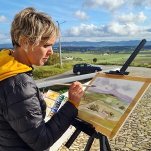 En 2022, tuve la maravillosa oportunidad de viajar a Portugal para aprender y compartir con maestros como Ari de Goes, de Brasil, y Joao Cabral, de Portugal. Esta idea surgió como un juego, un sueño, una locura, pero lo creí y trabajé para que se hiciera realidad. Fue durante ese viaje que pude adentrarme en el mundo del plein air, que considero la forma más hermosa de crear. Esta manera de plasmar permite que cada obra tenga el valor de ser vivida, espontánea y revitalizada, cargada de las diferentes sensaciones y sensibilidades que genera cada escenario.