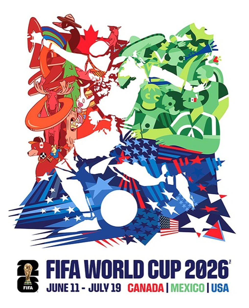 El diseño está dividido cromáticamente en tres sectores. El rojo representa a Canadá, con referencias visuales como el alce y la hoja de arce; el verde alude a México con íconos culturales y naturales propios del país; mientras que el azul y las estrellas simbolizan a Estados Unidos. En el centro, la figura blanca del jugador parece unir estos mundos, como si el fútbol funcionara como un lenguaje común capaz de cruzar fronteras.