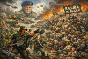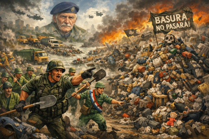 Es entonces allรญ, que un joven y valiente alcalde toma la decisiรณn de convocar al ejercito salvador, cansado ya de convocar a sus huestes comunales, que no responden, ni con hombres, ni con vehรญculos, que todos mandan y ninguno obedece, que dan parte de enfermo por tal de no ir a la guerra contra la basura.