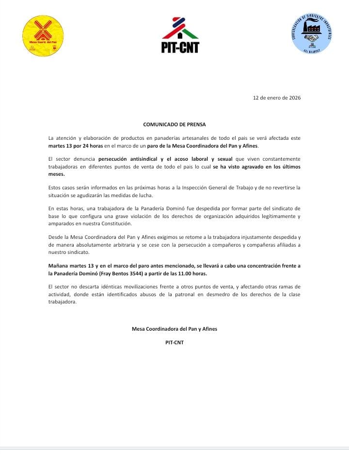 La atención y elaboración de productos en panaderías artesanales de todo el país se verá afectada este martes 13 por un paro de 24 horas convocado por la Mesa Coordinadora del Pan y Afines, con el respaldo del PIT-CNT. El conflicto surge por denuncias de persecución antisindical, acoso laboral y sexual, y el despido de una trabajadora por su afiliación gremial.