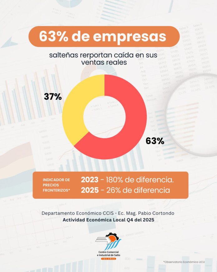 El 63% de las empresas salteñas manifestó una caída en sus ventas reales durante el último trimestre del año, según el informe de Actividad Económica Local – Q4 2025 presentado por el Departamento Económico del CCIS, bajo la responsabilidad del Ec. Mag. Pablo Cortondo.