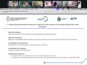 La propuesta, denominada “Cooperación para el fortalecimiento de la cadena de valor citrícola de Concordia (Argentina) y Salto (Uruguay)”, tiene como objetivo fortalecer la cadena citrícola regional a través de una agenda de trabajo conjunta, con foco en el desarrollo económico, la integración productiva y el fortalecimiento de capacidades técnicas.