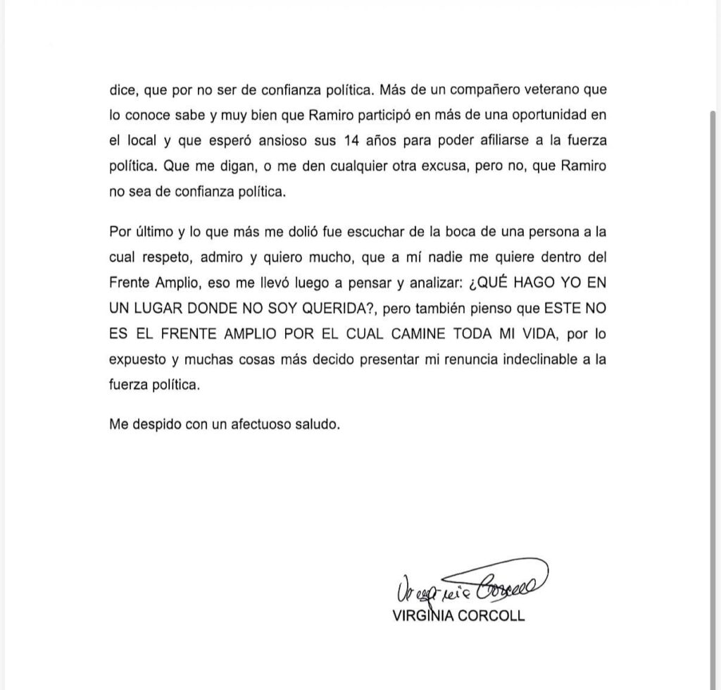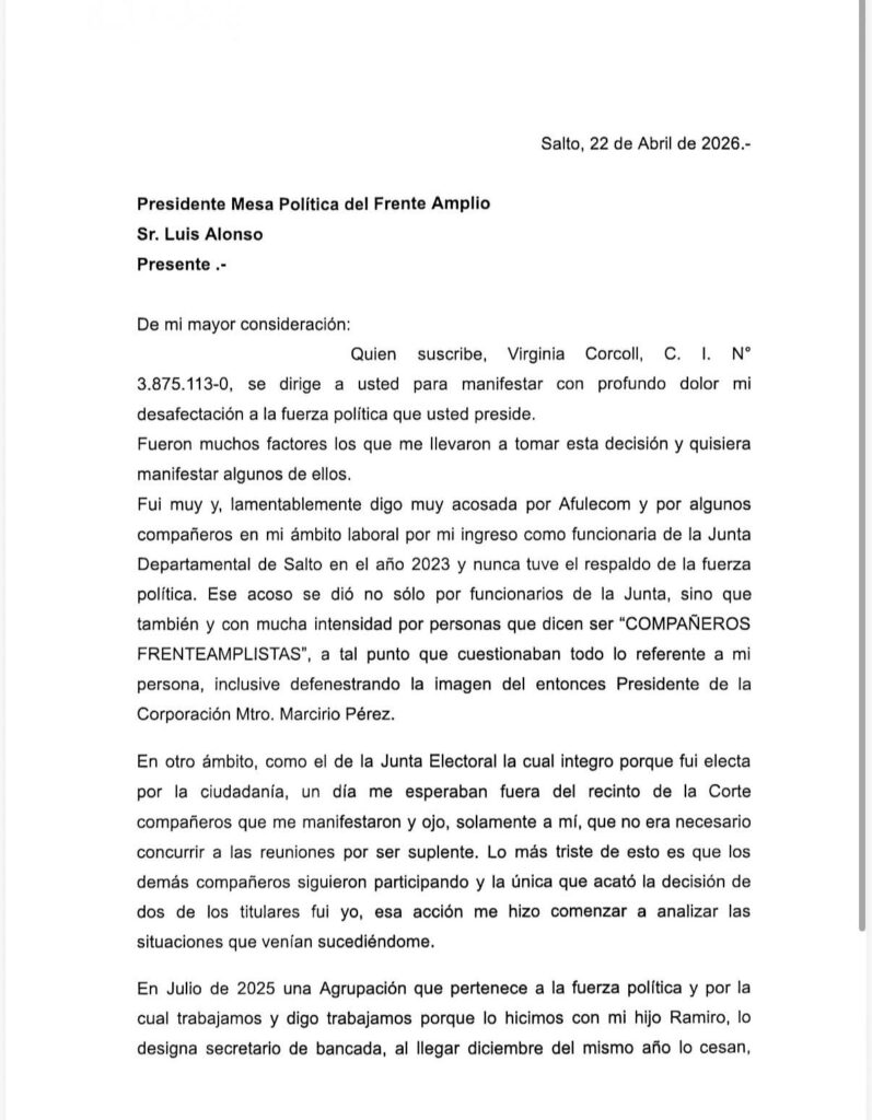 En carta dirigida al Pte. de la Mesa Política, Luis Alonso, Virginia Corcoll Mezzetta formalizó su renuncia indeclinable al Frente Amplio, argumentando situaciones de acoso laboral, cuestionamientos internos y ausencia de apoyo político. La decisión, cargada de contenido emocional y político, sacude a la interna frenteamplista salteña y abre interrogantes sobre el clima y la conducción dentro de la fuerza política.